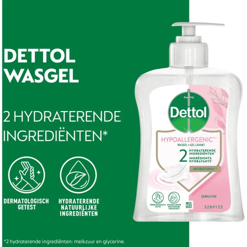 Dettol Hypoallergenic wasgel is verrijkt met twee hydraterende* natuurlijke ingrediënten, die je huid intensief voeden. Deze wasgel is antibacterieel** en helpt de verspreiding van bacteriën te voorkomen. De dermatologisch geteste formule behoudt de natuurlijke pH-waarde van je huid en is geschikt is voor gevoelige huid.