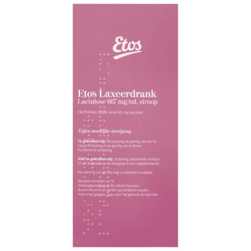 Etos Laxeerdrank Lactulose 667mg/ml wordt gebruikt bij de behandeling van verstopping/obstipatie (onregelmatige stoelgang, harde en droge ontlasting) en het zachter maken van de ontlasting, bijvoorbeeld wanneer u aambeien heeft of wanneer u een operatie heeft gehad aan uw anus of dikke darm.