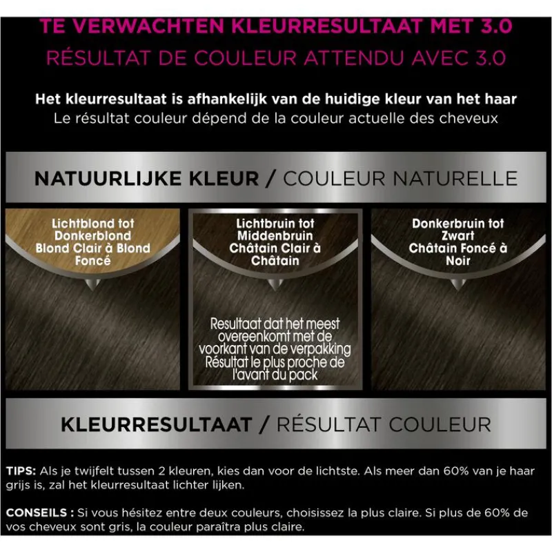 VOORZORGSMAATREGELEN HAARKLEURSTOFFEN KUNNEN ERNSTIGE ALLERGISCHE REACTIES VEROORZAKENLees en volg de instructies.Dit product is niet bestemd voor gebruik bij personen jonger dan 16 jaar.TIJDELIJKE TATOEAGES MET ZWARTE HENNA KUNNEN LEIDEN TOT EEN VERHOOGD RISICO OP EEN ALLERGISCHE REACTIE.Kleur uw haar niet als:• u last heeft van uitslag in het gezicht of van een gevoelige, geïrriteerde of beschadigde hoofdhuid• u eerder een reactie na een haarkleuring heeft gehad• u in het verleden een reactie heeft gehad na een tijdelijke tatoeage met zwarte hennaALLERGIE NEGEREN KAN LEVENSBEDREIGEND ZIJN Het is noodzakelijk een ALLERGIE WAARSCHUWINGSTEST 48 uur vóór iedere haarkleurbehandeling uit te voeren zelfs indien u al eerder een kleurproduct heeft gebruikt.Denk eraan het product 48 uur van te voren te kopen. (lees en volg de gebruiksaanwijzing). Bij een reactie of bij twijfel, raadpleeg een arts voordat u een kleurproduct gebruikt.”De ontwikkelvloeistof’’ bevat waterstofperoxide.“Het kleurproduct”a bevat: fenyleendiaminen, resorcinol, fenyleendiaminen (tolueendiaminen), ammoniak.• Bijgevoegde handschoenen dragen.• Contact van het product met de ogen vermijden. Niet gebruiken voor het kleuren van wimpers of wenkbrauwen. • Bij contact van het product met de ogen onmiddellijk met overvloedig water spoelen • Spoel het haar na de inwerktijd van het product goed uit.Wacht 2 weken na een permanent of een behandeling met een duurzaam gladmakend product.Niet gebruiken als uw haar gekleurd is met henna of een progressieve kleuring. Buiten bereik van kinderen houden.VOLG DE GEBRUIKSAANWIJZING Raadpleeg de ingrediëntenlijst onder dit kader.