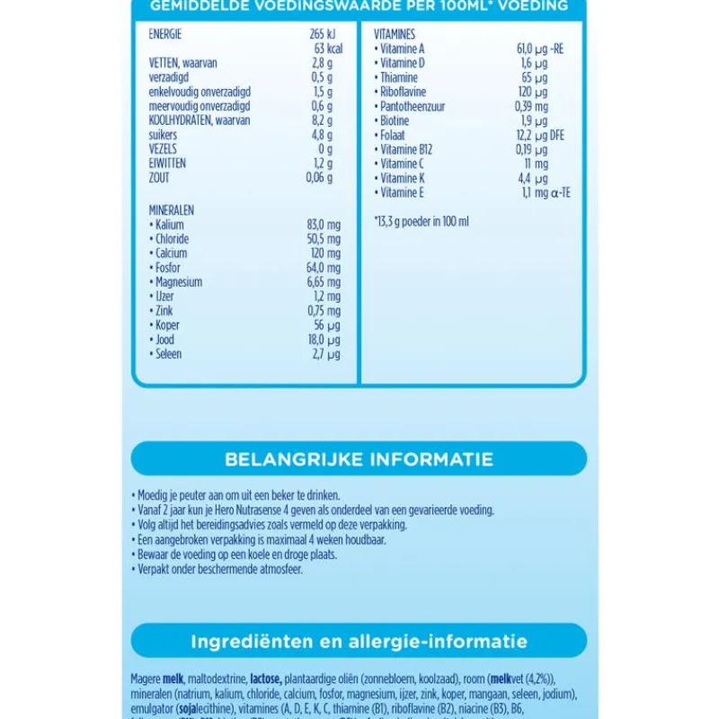 Belangrijke informatie. •Vanaf 2 jaar kun je Hero Nutrasense 4 geven als onderdeel van een gevarieerde voeding. • Volg altijd het bereidingsadvies zoals vermeld op deze verpakking.• Overleg voor gebruik met je consultatiebureau of arts. • Verpakt onder beschermende atmosfeer.