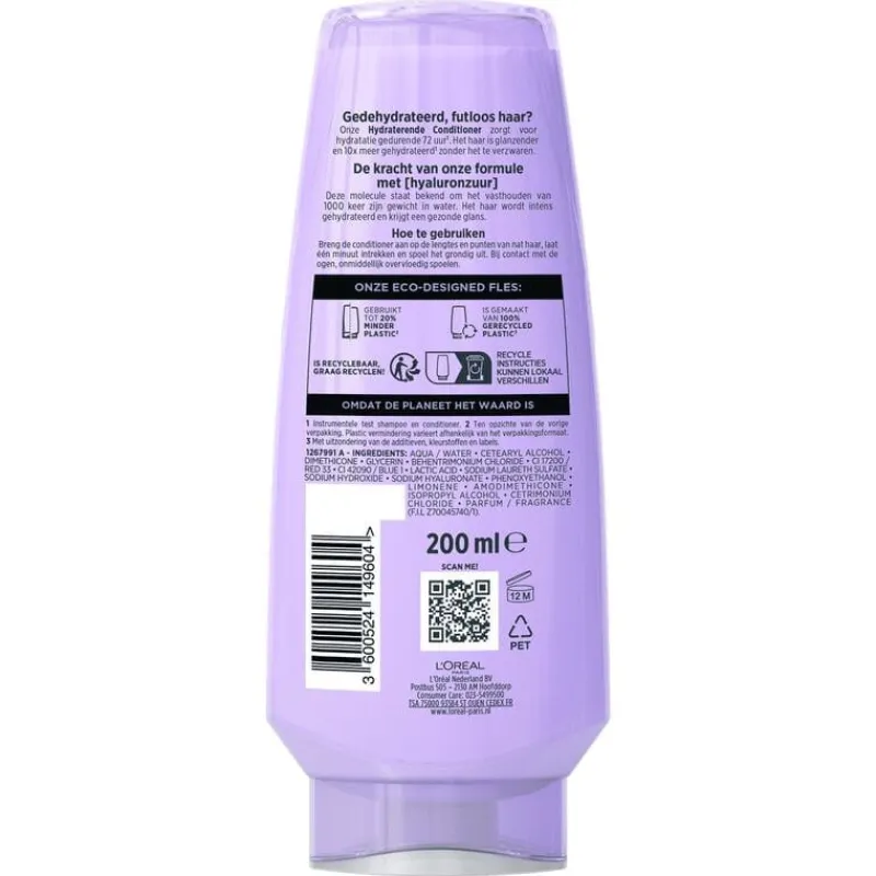L’Oréal Paris Elvive Hydra Hyaluronic Conditioner is speciaal ontworpen om verzwakt, futloos haar intensief te hydrateren. De formule is verrijkt met hyaluronzuur, een ingrediënt met hydraterende eigenschappen. Het helpt het haar te hydrateren en zorgt ervoor dat haar vocht vasthoudt. Het resultaat: een gezonde glans en 10x meer hydratatie***. De nieuwe duurzame verpakking van L’Oréal Paris Elvive Hydra Hyaluronic Conditioner is nu verkrijgbaar in het standaard 250ml formaat en bevat 20% minder plastic**. L’Oréal Paris Elvive Hydra Hyaluronic Conditioner biedt de perfecte hydratatie voor verzwakt, futloos haar. Hyaluronzuur staat bekend om zijn vermogen om 1000 keer zijn gewicht in water vast te houden. De hydraterende conditioner zorgt voor hydratatie gedurende 72 uur***. De nieuwe verpakking van deze conditioner is gemaakt van gerecycled plastic* en bevat 20% minder plastic**. Met deze milieubewuste verpakking draag je bij aan een schonere planeet, zonder in te leveren op kwaliteit en verzorging. *Met uitzondering van de additieven, kleurstoffen en labels. **Ten opzichte van de vorige verpakking. Plastic vermindering varieert afhankelijk van het verpakkingsformaat. ***Instrumentele test shampoo + conditioner.