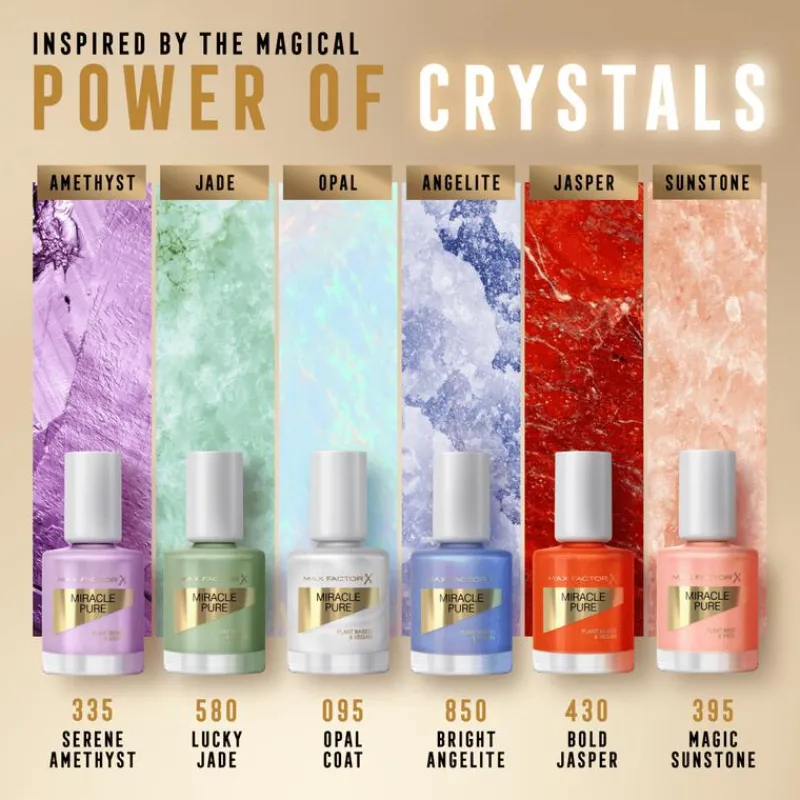 Ontdek de kracht van helende kristallen met de nieuwe nagelcollectie van Max Factor, geïnspireerd door de magie van edelstenen. Deze superglanzende nagellak heeft een plantaardige, ademende, vegan formule voor een geweldig kleurresultaat. De nagellak is zeer sneldrogend, wordt glad en zonder strepen aangebracht, is gemakkelijk te verwijderen en hij blijft goed zitten tijdens je dagelijkse bezigheden. Voor glanzende nagels met een gezonde uitstraling na het verwijderen van de lak.