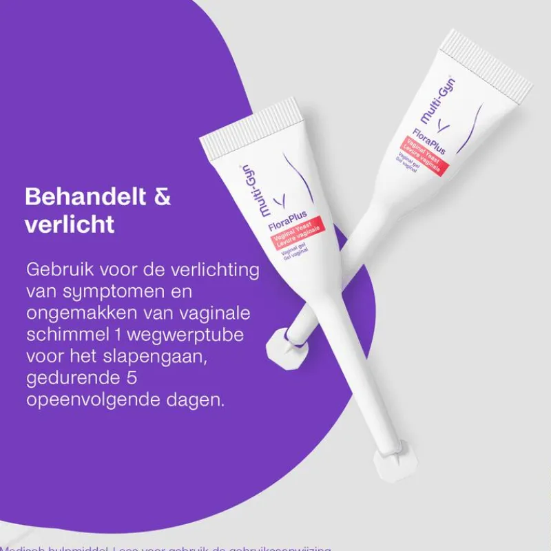 Multi-Gyn FloraPlus behandelt effectief symptomen en ongemakken van vaginale schimmel, zoals branderig gevoel, jeuk, irritatie en dikke, brokkelige witte afscheiding.