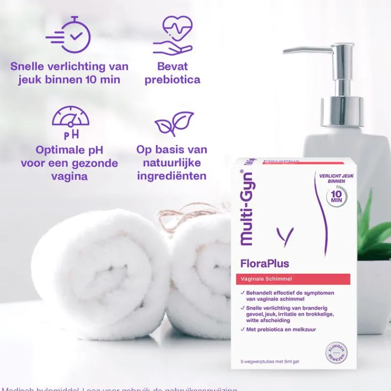 Verlicht jeuk binnen 10 minuten vanaf het 1e gebruik. Klinisch bewezen. Multi-Gyn FloraPlus is samengesteld met natuurlijk 2QR-complex, melkzuur en prebiotica. De gel heeft een optimale pH voor een gezonde vaginale flora. Bevat geen parfum, hormonen of ingrediënten van dierlijke oorsprong.