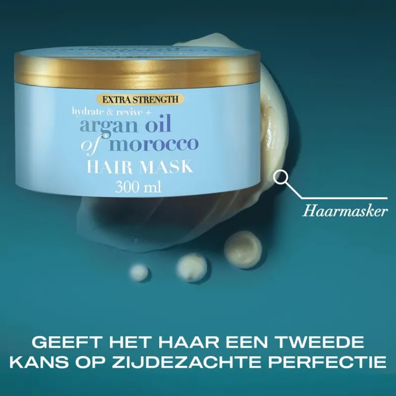 Gun je haar een intensieve, herstellende behandeling met dit luxueuze haarmasker van OGX. Deze krachtige formule is speciaal ontwikkeld om droge, broze en beschadigde lokken nieuw leven in te blazen. Verrijkt met voedende arganolie uit Marokko en zijde-eiwitten, dringt het diep door in het haar om vocht aan te vullen, breuk te helpen voorkomen en de natuurlijke zachtheid te herstellen. De rijke, crèmige textuur hydrateert intens en laat je haar al na 60 seconden voelbaar zachter en zichtbaar gezonder aanvoelen.