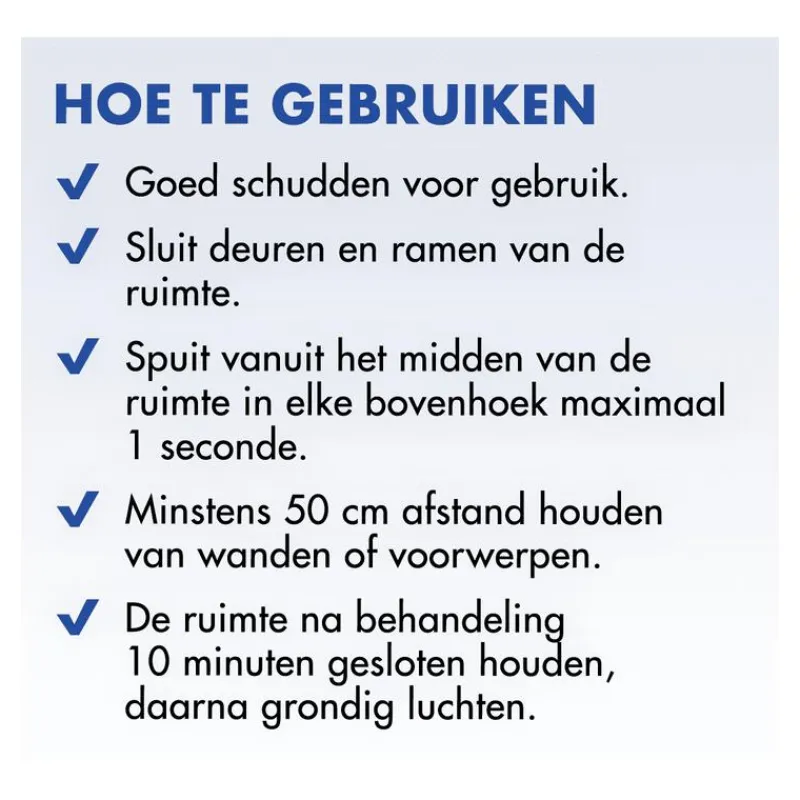 Gebruiksaanwijzing: Sluit eerst deuren en ramen van de te behandelen ruimte. Spuit vanuit het midden van de ruimte in elke bovenhoek niet langer dan 1 seconde. De ruimte na behandeling 10 minuten gesloten houden,daarna grondig luchten. De werkzame stof wordt fijn door de ruimte verdeeld en blijft in de lucht zweven. Insecten vliegen er doorheen en ademen de stof in.