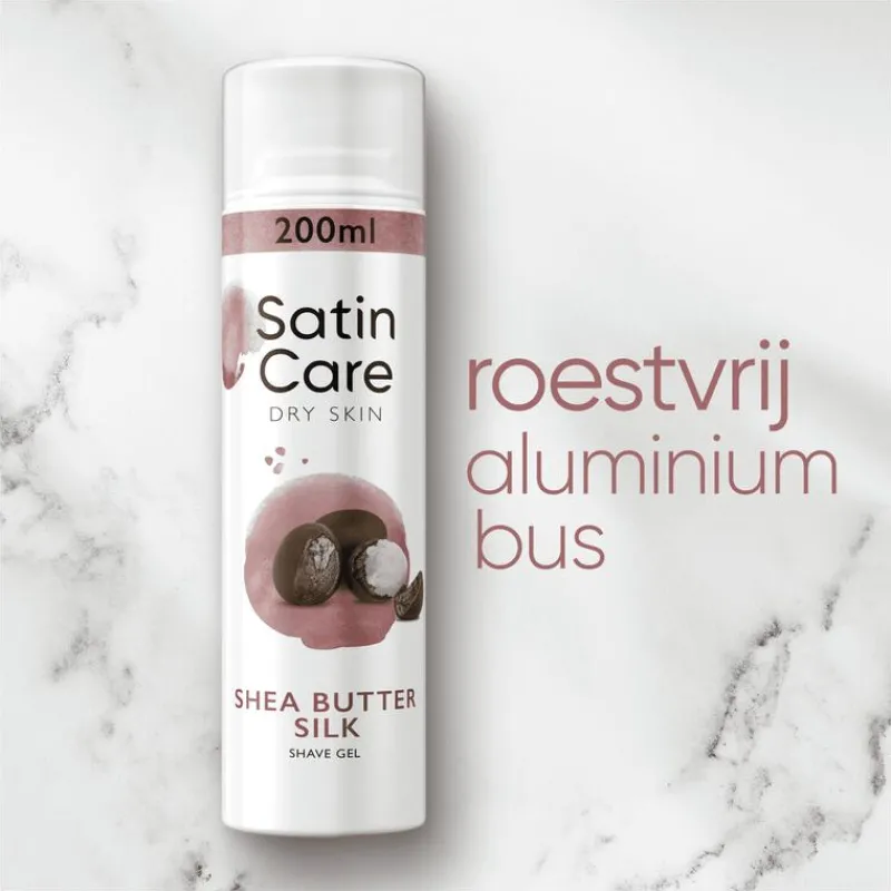 Gillette Satin Care Dry Skin Shea Butter Silk scheergel voor vrouwen is speciaal ontworpen voor de droge huid, en laat je huid na elke scheerbeurt glad en satijnzacht aanvoelen.