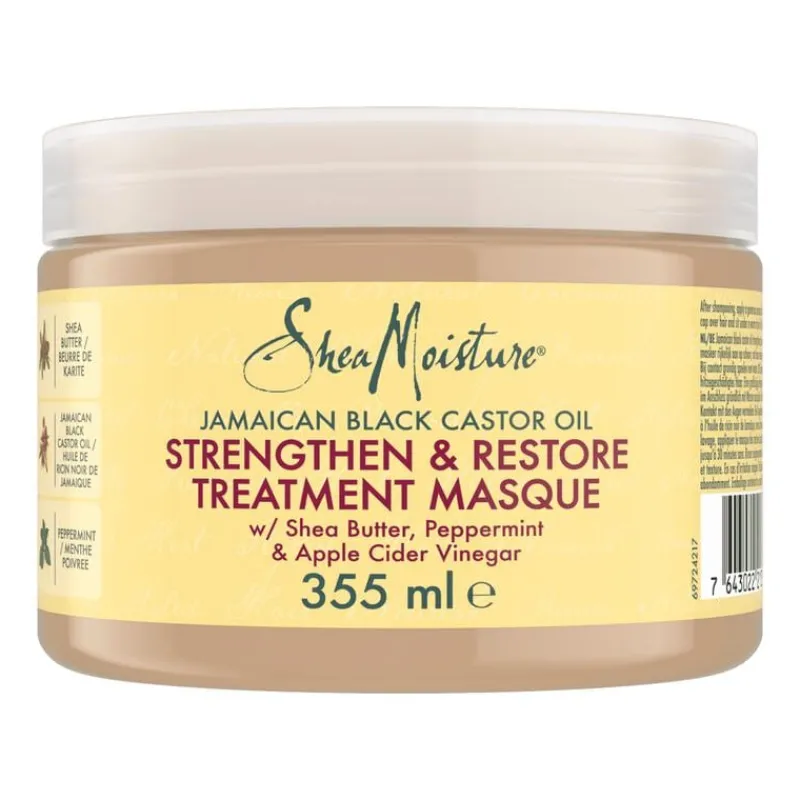 De SheaMoisture Jamaican Black Castor Oil Strengthen & Restore Treatment Masker is een verzorgende haarbehandeling die de kracht en veerkracht van beschadigd, broos of chemisch behandeld haar herstelt. Het masker is geschikt voor de behandeling van droog haar en perfect voor hen die hun haar regelmatig kleuren, steil maken, permanenten of met warmte stylen. Maar ook krullende of golvende natuurlijke stijlen kunnen profiteren van het voedende haarmasker. Het haarmasker bevat Jamaicaanse zwarte castorolie en fairtrade-sheaboter uit Ghana. De natuurlijke ingrediënten verzachten en hydrateren, terwijl ze tegelijkertijd zorgen voor een versterkend effect tijdens haarbehandelingen. Het ondersteunt de elasticiteit van het haar en zorgt voor glanzend, zacht en handelbaar haar. Dit haarproduct vermindert de kans op haarbreuk en gespleten haarpunten. Het masker hydrateert om beschadigd haar te herstellen en bevat pepermuntolie om de hoofdhuid te stimuleren. Een voedend haarmasker zonder sulfaten of siliconen. Hoe te gebruiken: Breng het diepvoedende haarmasker rijkelijk aan op schoon, nat haar met extra aandacht voor de punten. Laat het product 30 minuten inwerken en spoel het vervolgens grondig uit. Vermijd contact met de ogen, bij contact direct grondig spoelen met water. Het verhaal van SheaMoisture: SheaMoisture is de erfenis van Sofi Tucker, een pionierende ondernemer en moeder van vier kinderen. Al in 1912 verkocht zij zelfgemaakte schoonheidsproducten, zoals Shea Butter en African Black Soap, in Sierra Leone. We eren haar visie door gebruik te blijven maken van pure sheaboter, handgemaakt door vrouwen in Afrika. Door het kopen van onze haarproducten help je deze vrouwen om een betere, gezondere toekomst te realiseren. Onze producten zijn vier generaties lang getest op de Tucker-familie, maar nooit op dieren.
