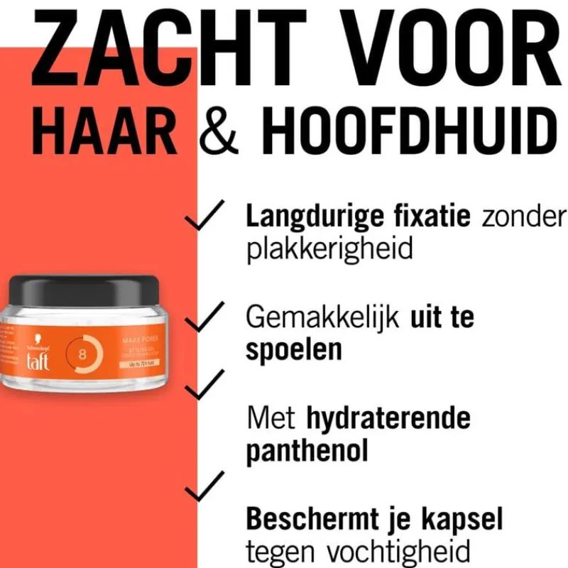Taft Maxx Power Styling Gel versterkt het haar van de haaraanzet tot in de puntjes. Het geeft je haar tot 72 uur hold. De formule plakt niet en is makkelijk uit te wassen. Deze gel is zacht voor haar en hoofdhuid en bevat hydraterende panthenol. Het helpt het haar te beschermen tegen vochtigheid. Alle Taft formules zijn vegan* en PETA gecertificeerd**.