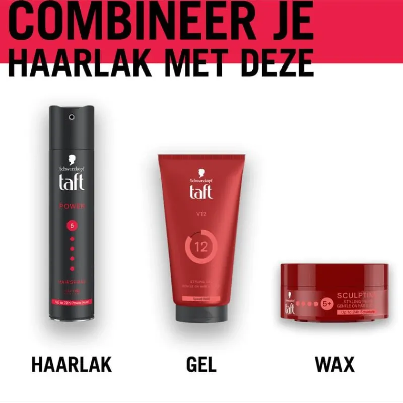 - Voor extra hold gedurende dag combineer je de paste met de Taft Power Haarspray