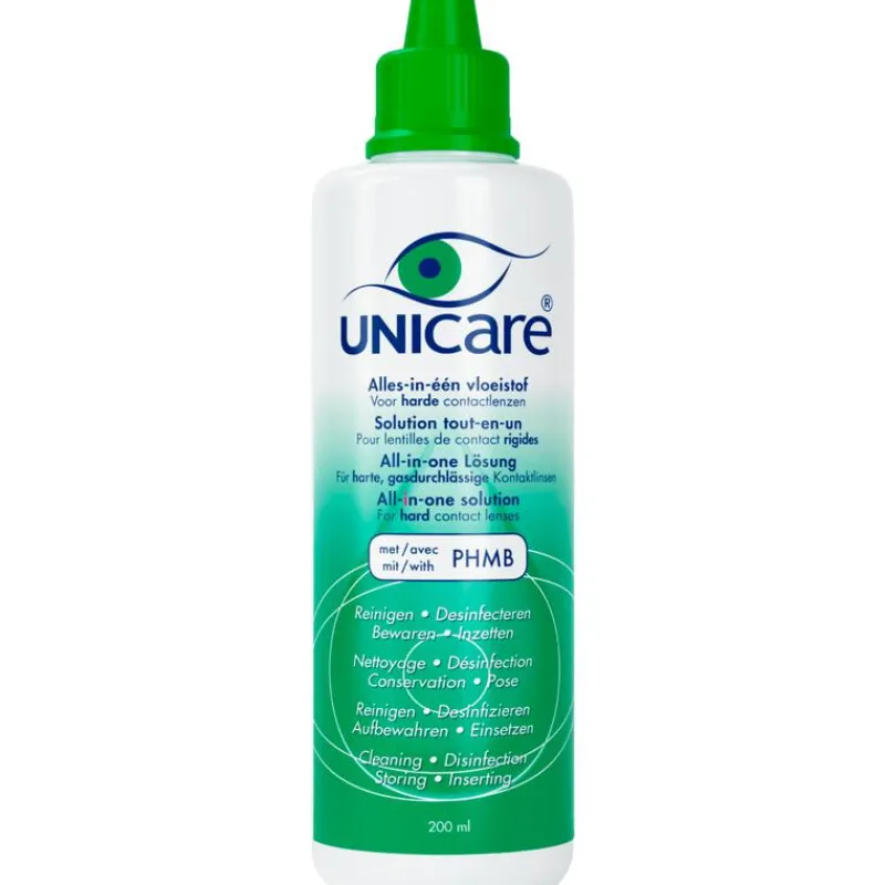 Unicare Alles-in-één vloeistof. Voor het reinigen, desinfecteren, bewaren en inzetten van harde contactlenzen.