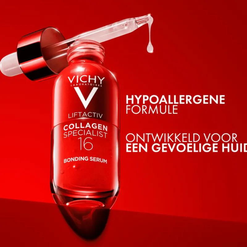Naarmate je ouder wordt, begint de collageenproductie af te nemen. Dit versnelt tekenen van huidveroudering, vooral rondom de ogen. Het nieuwe Liftactiv Collagen 16 Serum, ontwikkeld door de experts van Vichy, helpt 16 tekenen van huidveroudering* bestrijden, dankzij de innovatieve en unieke Co-Bonding Technologie: wallen, donkere kringen, rimpels onder de ogen, onzuiverheden, fijne lijntjes, stevigheid, huidverslapping, soepelheid, huidtextuur, tekenen van vermoeidheid, toniciteit, veerkracht, glans, elasticiteit, hydratatie, gelijkmatigheid.