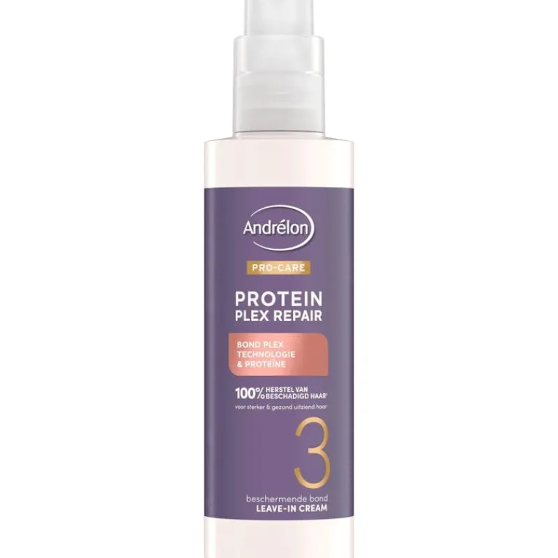 Andrélon Pro-Care Protein Plex Repair Leave-In Crème herstelt je haar en beschermt tegen toekomstige schade waardoor je beschadigde haar 100% herstelt* en je tot 94% minder last hebt van gespleten punten**.