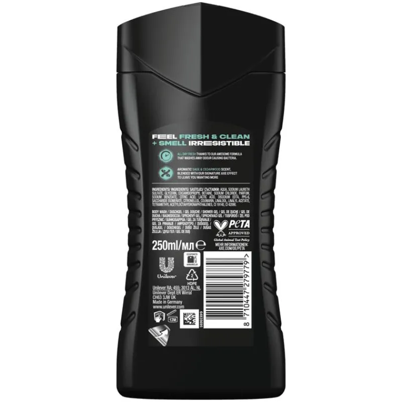 AXE Apollo 3-in-1 Douchegel voor lichaam, gezicht en haar hydrateert en houdt je 12 uur lang fris, met de heerlijke geur van salie en cederhout.