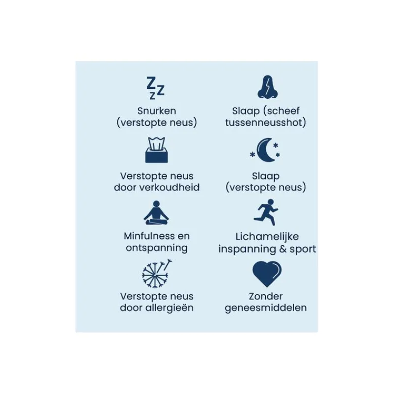 De huidvriendelijke kleefstrip bevat twee buigzame strookjes, waarmee je de strip eenvoudig over de neusbrug plakt. De strip tilt de neusvleugels extra stevig op, waardoor de neusgangen zich openen en je direct meer lucht krijgt. Deze verbeterde luchtstroom kan snurken door een verstopte neus helpen verminderen of zelfs helemaal laten verdwijnen.