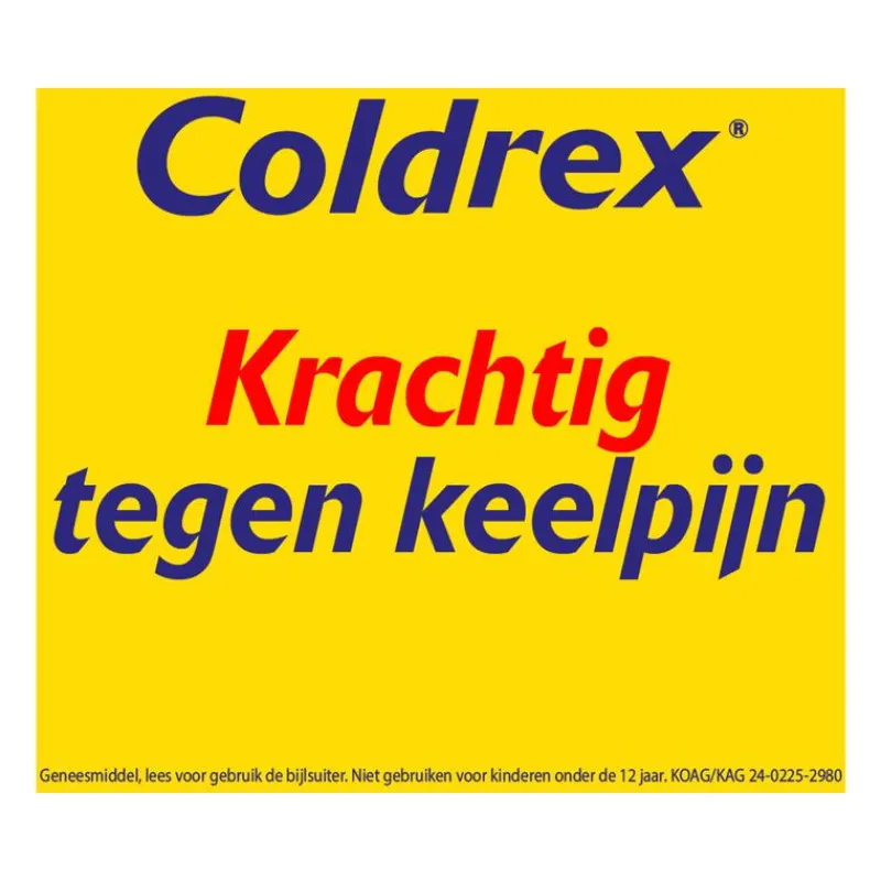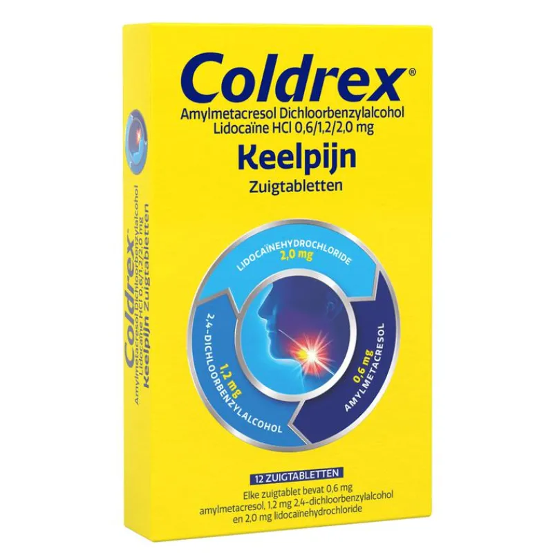 Gebruik Coldrex Keelpijn Zuigtabletten met 2 milligram van de krachtige pijnstiller lidocaïne. Stilt snel, effectief én lokaal de keelpijn. De gele zuigtabletten bevatten amylmetacresol en 2,4-dichloorbenzylalcohol – beide ontsmettende (desinfecterende) stoffen en lidocaïnehydrochlolride – een plaatselijk pijnstillende stof voor de keel. Deze keeltabletten zijn voor volwassenen en jongeren vanaf 12 jaar en ouder.