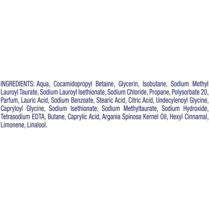 Aqua, Cocamidopropyl Betaine, Glycerin, Isobutane, Sodium Methyl Lauroyl Taurate, Sodium Lauroyl Isethionate, Sodium Chloride, Propane, Polysorbate 20, Parfum, Lauric Acid, Sodium Benzoate, Stearic Acid, Citric Acid, Undecylenoyl Glycine, Capryloyl Glycine, Sodium Isethionate, Sodium Methyltaurate, Sodium Hydroxide, Tetrasodium EDTA, Butane, Caprylic Acid, Argania Spinosa Kernel Oil, Hexyl Cinnamal, Limonene, Linalool.