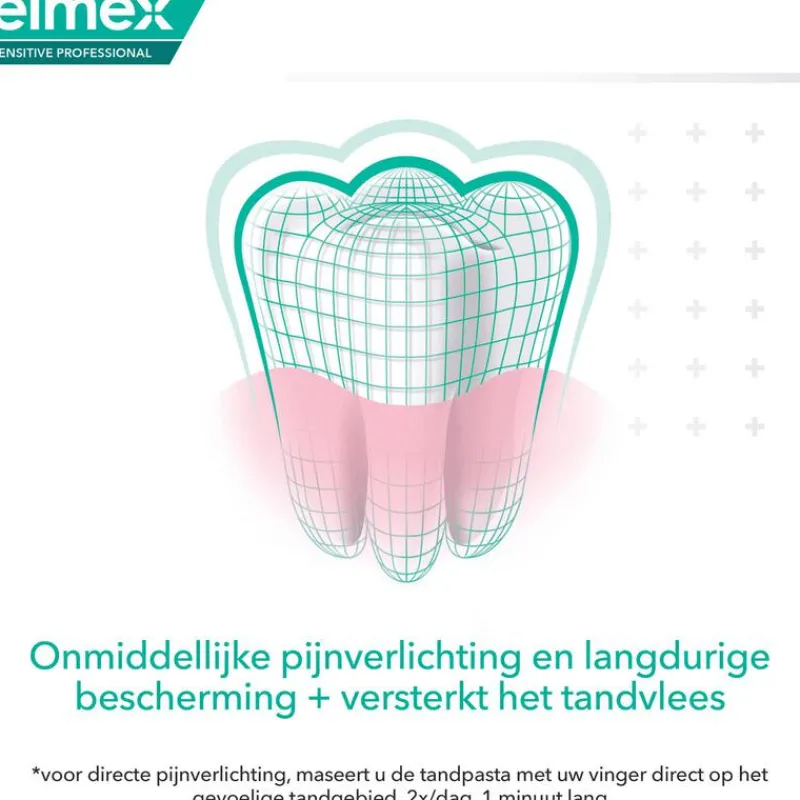 De elmex® Sensitive Professional Repair & Prevent tandpasta geeft directe* pijnverlichting en voorkomt verdere gevoeligheid. Een exclusieve formule die is gebaseerd op de klinisch bewezen PRO-ARGIN® technologie die tandartsen hun patiënten adviseren om de pijn van gevoelige tanden te verzachten. De elmex Sensitive Professional Repair & Prevent tandpasta bevat zink om terugtrekkend tandvlees, de belangrijkste veroorzaker van gevoeligheid, te voorkomen.