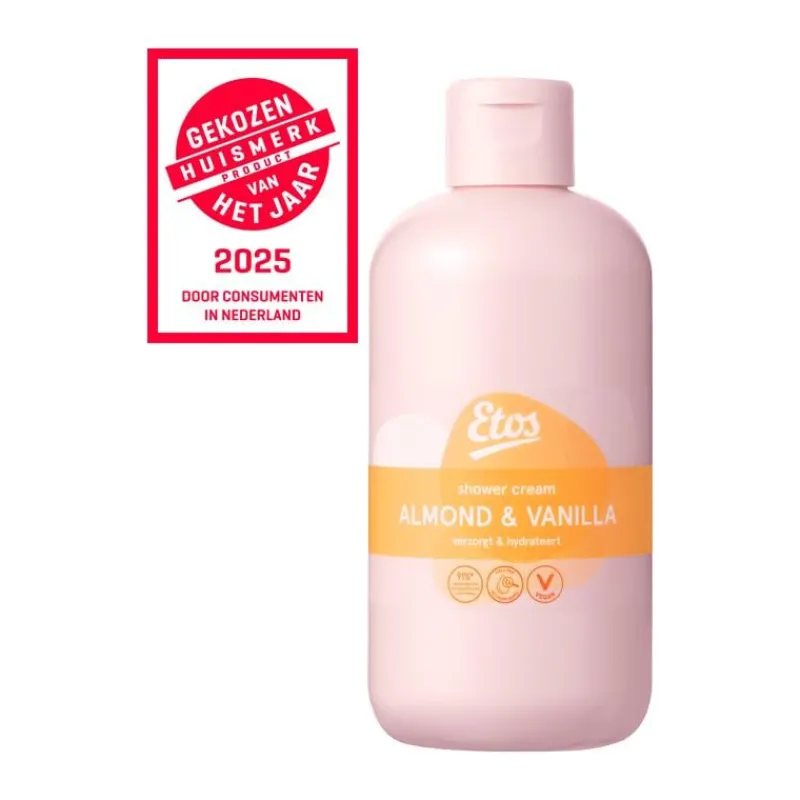 Etos douchecrème almond & vanilla is verrijkt met extracten van amandel en vanille De vochtinbrengende bestanddelen helpen de huid te verzorgen en hydrateren. Etos shower cream almond & vanilla bevat 91%* ingrediënten van natuurlijke oorsprong en is dermatologisch getest.