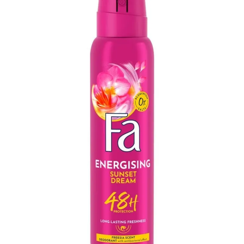 Ontdek de Fa Sunset Dream Deodorant Spray 150ml met de tropische geur die doet denken aan een dromerige zonsondergang. De vegan formule biedt 48 uur bescherming tegen nare geurtjes en is vrij van aluminiumzouten.