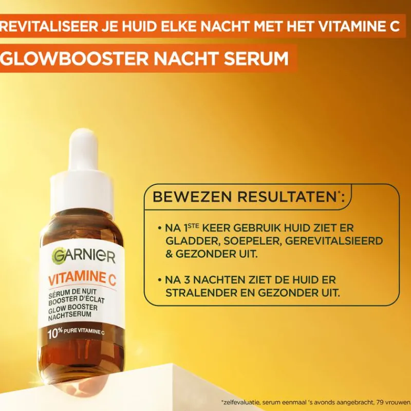 Resultaten: – Na het eerste gebruik:* De huid lijkt gladder, soepeler, gerevitaliseerd en uitgerust. – Na 3 nachten:* De huid ziet er stralender & gezonder uit. – Na 2 maanden:** Zichtbare vermindering van pigmentvlekken, de huid straal, fijne lijntjes zijn verminderd, de huid lijkt zichtbaar egaler en gladder. *zelf-evaluatie, serum één keer per nacht aangebracht door 79 vrouwen **klinische test, serum één keer per nacht aangebracht door 79 vrouwen. Gebruiksaanwijzing: Breng 3-4 druppels aan op een schoon gezicht en een schone hals. Vermijd de oogcontouren. Dit serum op waterbasis bevat een hoge concentratie puur vitamine c van natuurlijke oorsprong. Het is geformuleerd zonder siliconen waardoor de huid mogelijk de eerste seconden na aanbrengen ‘plakkerig’ aanvoelt. Gebruik een nachtcrème voor het optimale resultaat. Vermijd de oogcontouren. Bij contact met de ogen onmiddellijk overvloedig met water spoelen. Garnier SkinActive Vitamine C Routine: Stap 1: Gebruik de Garnier SkinActive Micellair Reinigingswater Vitamine C* om je gezicht te reinigen, make-up te verwijderen en je huid te verzachten. Stap 2: Breng overdag een 1 gevulde pipet van het Garnier SkinActive Vitamine C* Anti-Pigmentvlekken dagserum en ’s avonds 3-4 druppels van het Garnier Skinactive 10% Pure Vitamine C* Anti-Pigmentvlekken Nachtserum aan op het gezicht. Breng aan op een schoon gezicht en een schone hals. Vermijd hierbij de oogcontouren. Verminder zo pigmentvlekken en laat de huid stralen**. Stap 3: Breng de Garnier Bio Dagcrème met Vitamine C* of Garnier SkinActive – Serum Cream met Vitamine C* en SPF 25 aan om je huid te hydrateren en een natuurlijke glow boost te geven. Stap 4: Gebruik de Garnier SkinActive Glow Booster Oogcrème Met Vitamine C* om ook de oogcontouren een glow boost te geven en de effectieve tekenen van vermoeidheid te verminderen***. Gebruik daarnaast het Garnier SkinActive Tissue Masker met Vitamine C* drie keer per week: na 15 minuten is de huis intens gehydrateerd, ziet er stralend uit en voelt soepeler aan. Een vitamine C derivaat zoals vitamine Cg heeft de voordelen van vitamine C, maar dan in een gestabiliseerde formule. Vitamine C is van nature instabiel wanneer het wordt blootgesteld aan verschillende externe factoren, zoals zuurstof en zonlicht, waardoor het moeilijk is om het op betrouwbare wijze te formuleren in cosmetische producten. De houdbaarheid na openen van vitamine C formules met een derivaat is vaak langer dan die van puur vitamine C. *Vitamine Cg is een afgeleide van Vitamine C **zelf-evaluatie, serum één keer per nacht aangebracht door 79 vrouwen *** klinische score, 75 personen na 4 weken, gemiddeld resultaat, individuele resultaten kunnen verschill