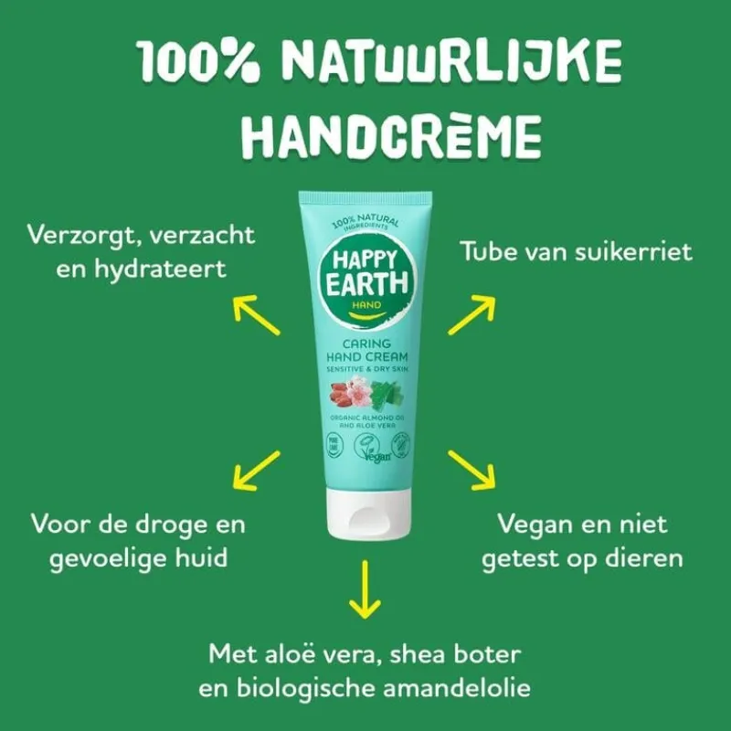 Deze handcrème is speciaal ontwikkeld voor de gevoelige en droge huid. Het bevat aloë vera, shea boter en biologische amandelolie die helpen de huid op een natuurlijke manier te hydrateren en te verzorgen. De crème trekt zeer snel in en is niet vettig. Het heeft een heerlijk, allergeenvrij parfum dat licht ruikt naar amandel en perzik. Dit product is, net als alle andere producten van Happy Earth, 100% microplasticvrij. De verpakking is een 100% biobased tube gemaakt van suikerriet en Happy Earth wordt geproduceerd in Nederland met groene energie.