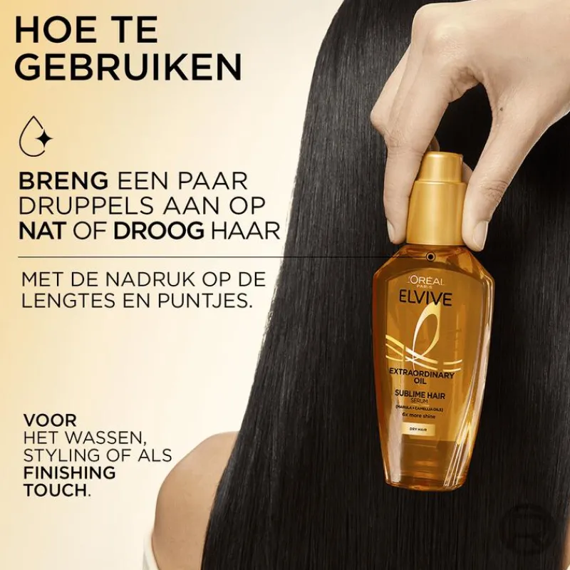 - Elvive Extraordinary Oil is speciaal ontwikkeld voor droog haar dat behoefte heeft aan voeding, waardoor het haar ruw, dof en levenloos aanvoelt. De luxueuze, olie-rijke formule voedt het haar vanaf de wortel tot de punt.