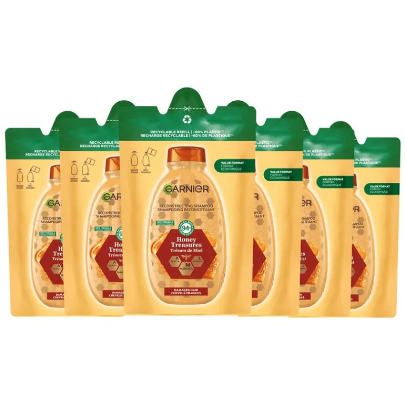 Minder plastic*, m€€r voordeel. Word ook een shampoo refiller! Garnier Loving Blends Honing Goud Shampoo Refill is jouw vertrouwde shampoo, maar nu hervulbaar. Garnier Loving Blends Honing Goud Shampoo is de ideale keuze voor beschadigd en breekbaar haar. Deze herstellende shampoo combineert de voedende kracht van acacia, manuka & lavendel honing met een duurzame oplossing: een recyclebare refill van 250 ml. Garnier Loving Blends Honing Goud Shampoo voedt je haar en herstelt zichtbaar de tekenen van schade, zoals 10 minder haarbreuk**, 2x minder gespleten punten*** en 53% minder haarscheuren***. De navulbare verpakking van deze shampoo bevat 60% minder plastic**, wat het eenvoudig maakt om bij te dragen aan een duurzamere levensstijl terwijl je je haar intensief verzorgt. *Deze shampoo is gemaakt van 60% minder plastic in vergelijking met het gebruik van onze 250ml fles shampoo. **Instrumentele test. **Oppervlakteschade, Instrumentele test na het gebruik van shampoo + masker. ***Instrumentele test na gebruik van shampoo en conditioner of na het masker alleen.