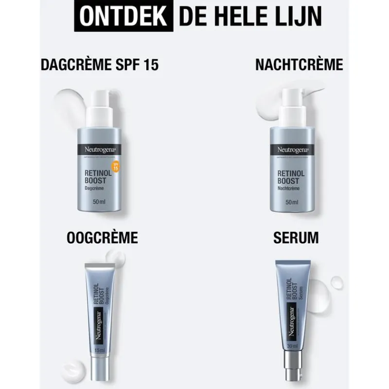 Neutrogena Retinol Boost Serum is een licht en zacht serum, ontwikkeld met dermatologen, dat meerdere tekenen van huidveroudering effectief bestrijdt. Het helpt fijne lijntjes, rimpels, droogheid, gebrek aan stevigheid en pigmentvlekken te verminderen, voor een zichtbaar jongere en gezondere huid.Het serum bevat pure retinol, een door dermatologen aanbevolen vorm van vitamine A, die de huidtextuur verbetert, dofheid vermindert en pigmentvlekken egaliseert. Mirtenbladextract versterkt de effectiviteit van retinol en stimuleert huidvernieuwing, terwijl hyaluronzuur de huid intensief hydrateert en een stralende, gladde huid achterlaat.De resultaten zijn wetenschappelijk bewezen: onmiddellijk voelt de huid zachter aan en is de huidtextuur verbeterd. Na 1 week vervagen fijne lijntjes en oogt de huid stralender en zuiverder. Na 4 weken worden pigmentvlekken verminderd en tekenen van zonneschade vervagen. Na 8 weken is de teint egaler, zijn fijne lijntjes duidelijk verminderd en ziet de huid er stralend en gezond uit*.Het serum is licht, trekt snel in en is geschikt voor dagelijks gebruik. De formule is mild voor de huid en ideaal voor iedereen die een effectieve anti-aging verzorging zoekt zonder irritatie.*Wetenschappelijke studie, 31 vrijwilligers, 1x daags gebruik.