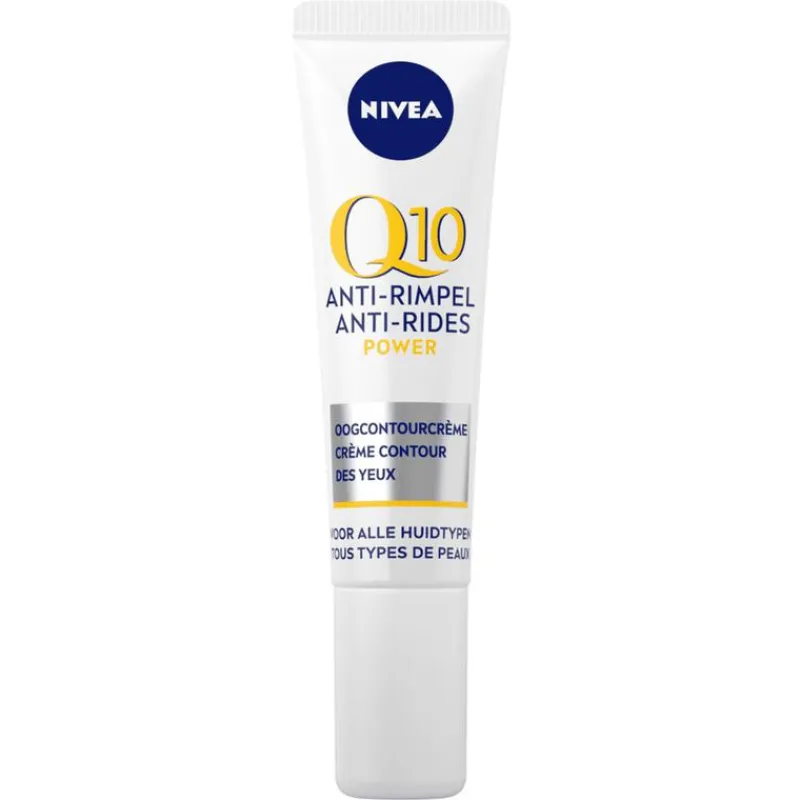 Geef de kwetsbare huid rond je ogen een opfrisser met NIVEA Q10 POWER Oogcontourcrème. De oogcontourcrème is ontwikkeld voor iedereen met donkere kringen, wallen of (beginnende) kraaienpootjes. De speciale formule zorgt ervoor dat de huid rond de ogen egaliseert, terwijl rimpels zichtbaar verminderen. De huid wordt voelbaar steviger en oogt frisser dankzij de revitaliserende werking van deze oogcontourcrème.NIVEA Q10 POWER Oogcontourcrème is een antirimpelcrème die bevat krachtige ingrediënten zoals Q10 en creatine, die celvernieuwing stimuleren en de aanmaak van collageen bevorderen. Deze combinatie zorgt voor een frisse uitstraling en verstevigde oogcontouren. De antioxidanten in de crème beschermen de gevoelige huid rondom de ogen tegen vroegtijdige huidveroudering en verminderen zichtbaarheid van donkere kringen, wallen en fijne lijntjes, waardoor je een jeugdiger uitstraling krijgt. • Zichtbaar minder kraaienpootjes en andere fijne lijntjes• Effectief tegen wallen en donkere kringen• Geeft de ogen een frisse uitstraling• Verrijkt met Q10 en creatine• Geschikt voor alle huidtypen