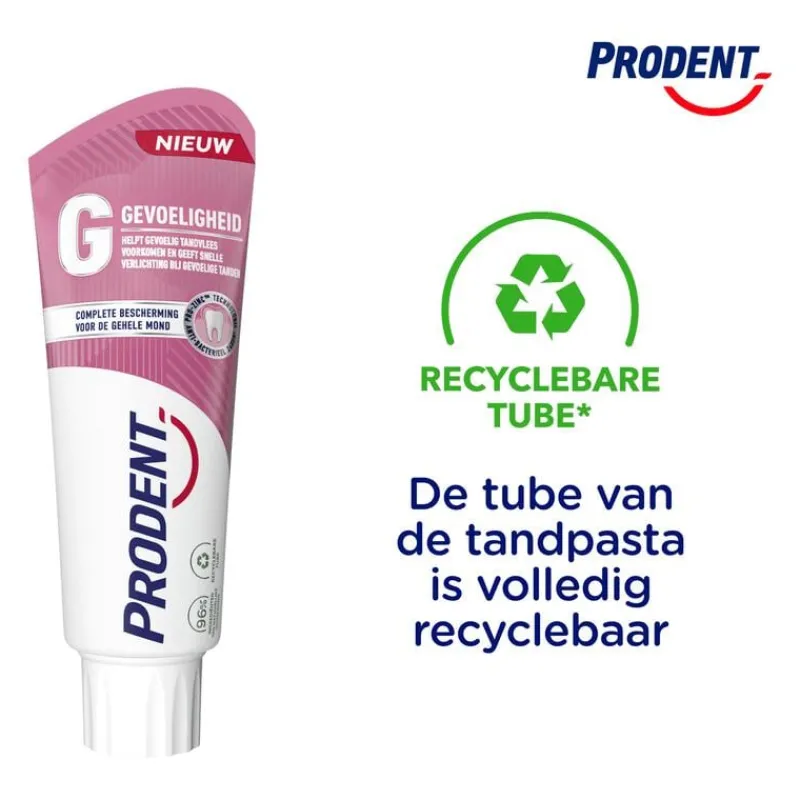 - Deze tandpasta van Prodent is verpakt in een recyclebare tube