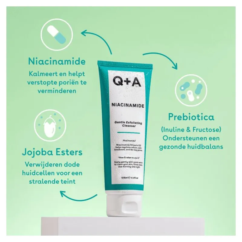 Hoe gebruik ik de Niacinamide Exfoliating Cleanser? Masseer zachtjes in op de natte huid met ronddraaiende bewegingen, met veel aandacht voor vette zones zoals de T-zone. Spoel schoon met lauwwarm water. Deze cleanser kan ’s ochtends of ’s avonds gebruikt worden, maar omdat het een exfoliërende werking heeft, raden we aan om het slechts één keer per dag te gebruiken. Je huid is nu klaar voor de volgende stap, goed te gebruiken in combinatie met Q+A Azeliac Acid Balancing Serum en/of Q+A Zinc PCA Daily Moisturiser
