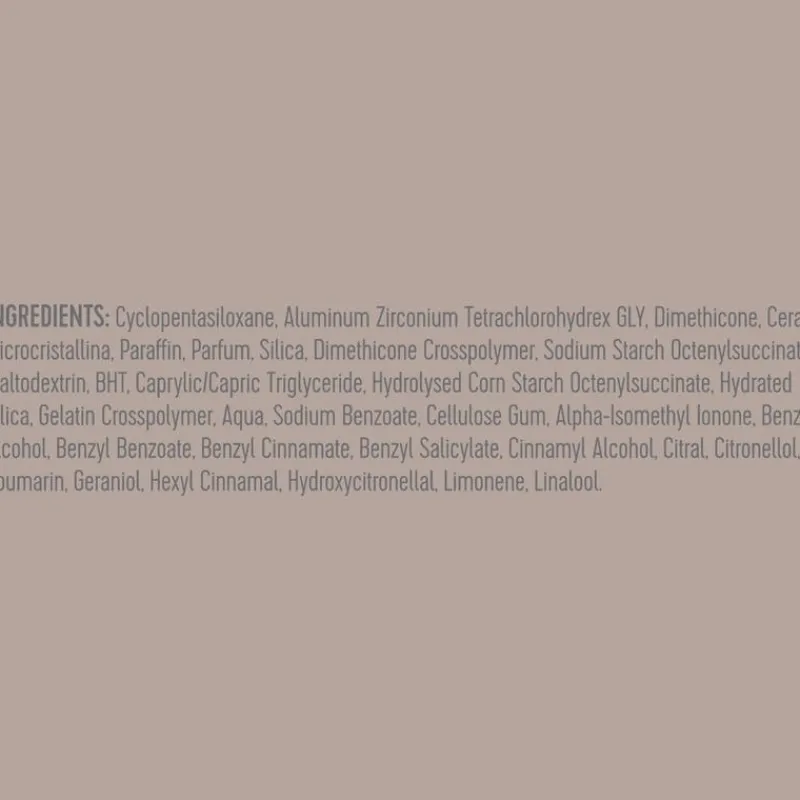 Cyclopentasiloxane, Aluminum Zirconium Tetrachlorohydrex GLY, Dimethicone, Cera Microcristallina, Paraffin, Parfum, Silica, Dimethicone Crosspolymer, Sodium Starch Octenylsuccinate, Maltodextrin, BHT, Caprylic/Capric Triglyceride, Hydrolysed Corn Starch Octenylsuccinate, Hydrated Silica, Gelatin Crosspolymer, Aqua, Sodium Benzoate, Cellulose Gum, Alpha-Isomethyl Ionone, Benzyl Alcohol, Benzyl Benzoate, Benzyl Cinnamate, Benzyl Salicylate, Cinnamyl Alcohol, Citral, Citronellol, Coumarin, Geraniol, Hexyl Cinnamal, Hydroxycitronellal, Limonene, Linalool.