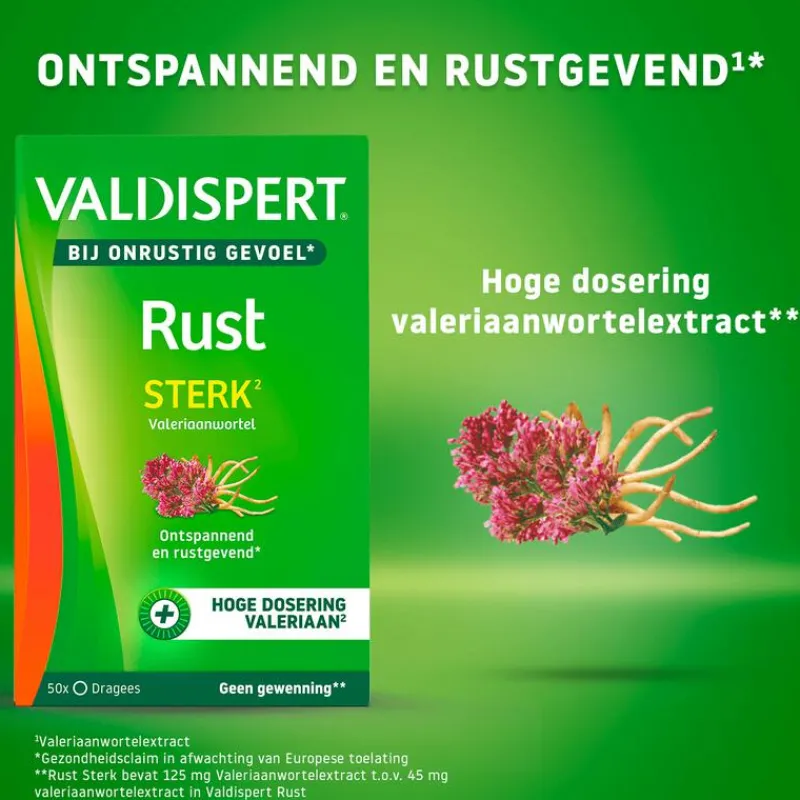 Valdispert Rust Extra Sterk is op basis van een natuurlijk, plantaardig en zuiver extract van valeriaanwortel. (Valeriana officinalis) In de wortel zitten werkzame stoffen met rustgevende eigenschappen.DE VOORDELEN VAN VALDISPERT RUST STERK:• Ontspannend en rustgevend*• Bij onrustig gevoel*, spanning, stressmomenten en geestelijke inspanning*• Geeft geen gewenning, is veilig in gebruik zolang je de gebruiksaanwijzing volgt• Bevat geen conserveermiddelen• Vrij van geur- en smaakstoffen*gezondheidsclaim in afwachting van Europese toelatingGEBRUIK:Dosering: 3x per dag 2 dragees innemen. De aanbevolen dosering niet overschrijden. Slik de dragee in z’n geheel door, bijvoorbeeld met water. Valdispert Rust Sterk kan regelmatig en gedurende langere tijd gebruikt worden.Niet geschikt voor kinderen onder de 12 jaar. Dit is een voedingssupplement. Zorg voor gevarieerde, evenwichtige voeding en een gezonde levensstijl: een supplement is een aanvulling, geen vervanging. Houd het middel buiten bereik van kinderen. Geschikt voor vegetariërs.