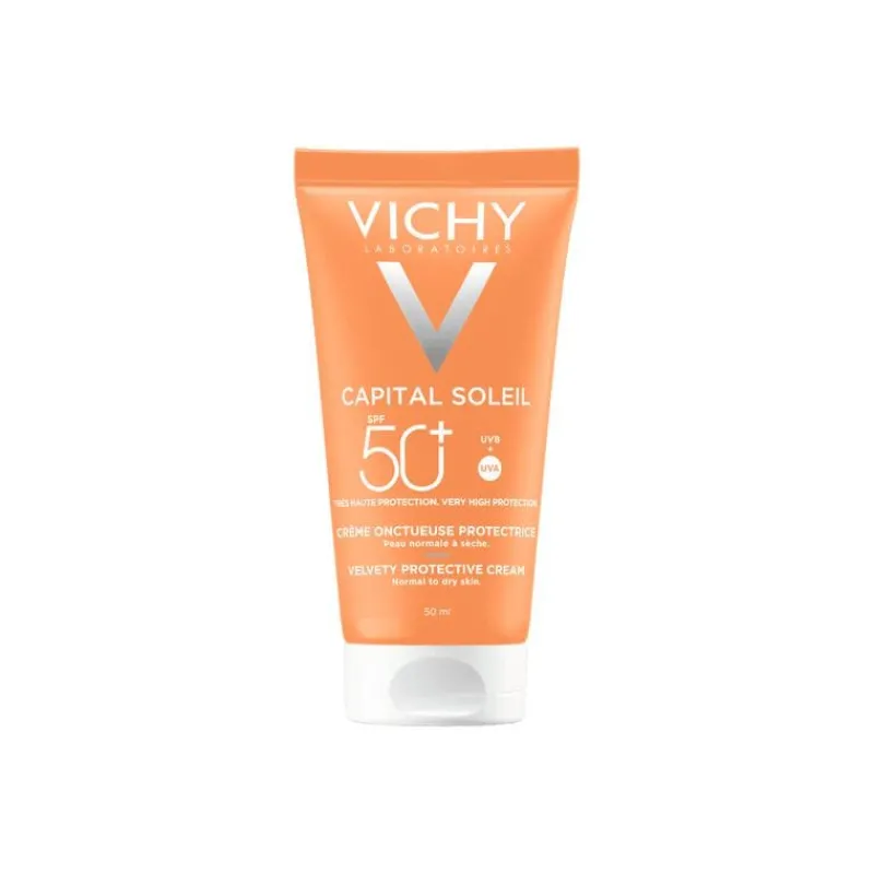 Vichy’s Capital Soleil SPF50+ Fluweelachtige Zonnecrème is een hydraterende verzorging voor het gelaat die de huid helpt te beschermen tegen de schadelijke effecten van de zon. De zonbescherming met een zijdezachte textuur is verrijkt met hyaluronzuur om uw huid te hydrateren. Verder bevat de formule een fotostabiele filtersysteem met een groot UV-A/UV-B-spectrum op basis van Mexoryl®, voor een langere UV-A bescherming (3/4 van UV) om uw huid een nog betere bescherming en meer voordelen te bieden.