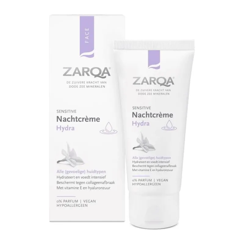 In de nacht herstelt je huid. Je huid scheidt dode huidcellen af en maakt nieuwe aan. Door je huid voor het slapen te verzorgen met Zarqa Nachtcrème Hydra help je je huid een handje. De milde maar intensief hydraterende crème met hyaluronzuur en vitamine E maakt de huid zacht en soepel, en beschermt tegen collageenafbraak. De crème dringt diep door in de huid en is geschikt voor alle huidtypen, maar in het bijzonder geschikt voor de vochtarme huid. Ook geschikt voor de meest gevoelige huidtypen.