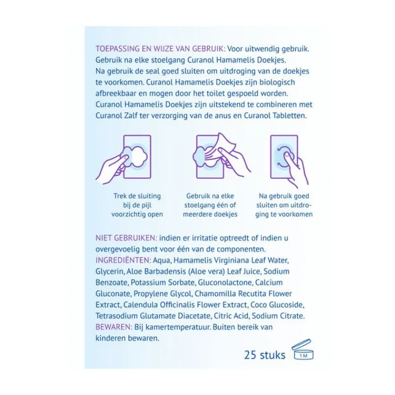 Curanol vochtige Hamamelis Doekjes voor een zachte reiniging en intensieve verzorging van de huid rond de anus. Gebruik na elke stoelgang. Curanol Hamamelis Doekjes zijn biologisch afbreekbaar en mogen door het toilet gespoeld worden. De Curanol Hamamelis Doekjes zijn 100% plasticvrij en zijn verzachtend, verkoelend, kalmerend en pH-huidneutraal. 0% kleurstoffen, parfum en parabenen. Curanol Hamamelis Doekjes zijn uitstekend te combineren met Curanol Zalf en Curanol Tabletten.