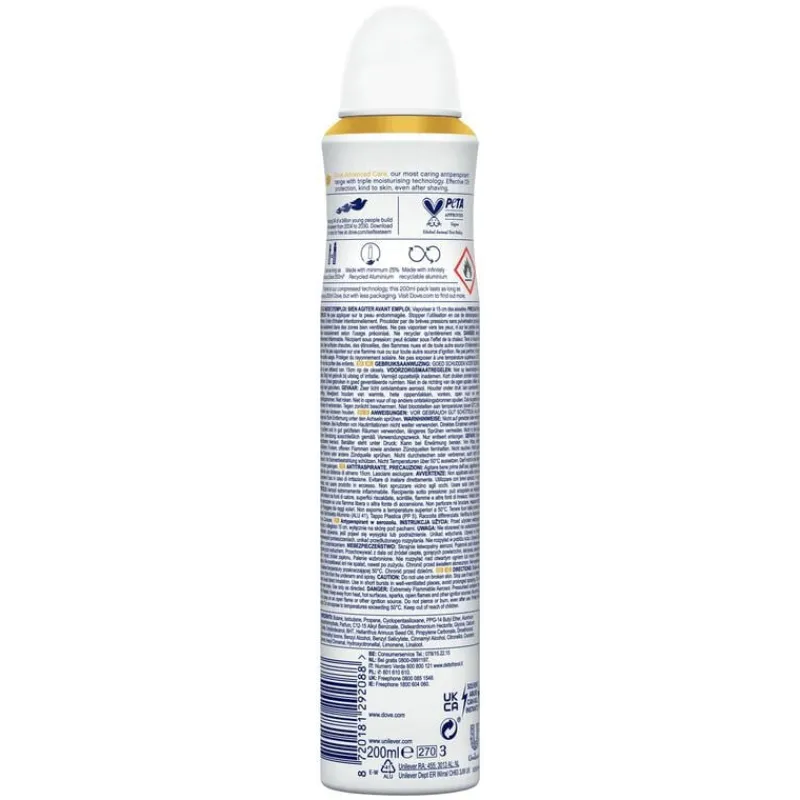 Dove Advanced Care Invisible Dry Anti-Transpirant Deodorant Spray heeft een heerlijke geur van witte fresia en viooltjes en beschermt zowel je oksels als je kleding. De anti-transpirant is onzichtbaar bewezen op zwart en wit. De Dove Advanced Care anti-transpiranten maken deel uit van de meest verzorgende lijn van Dove, met de verbeterde gepatenteerde formule zijn ze zacht voor de huid, zelfs na het scheren. Het Advanced Care assortiment van Dove biedt met de Triple Moisturising technologie 72 uur bescherming tegen zweet. De hele dag een fris en verzorgd gevoel – wat de dag je ook brengt! De semi-compressed spuitbus van 200 ml gaat even lang mee als de gewone versie van 250 ml, bovendien zorgt onze compressed technologie dat onze deodorants hun gas langzaam afgeven, zodat ze ook milder zijn voor de huid.