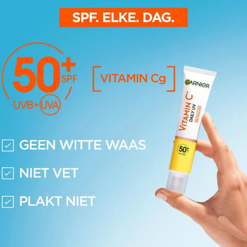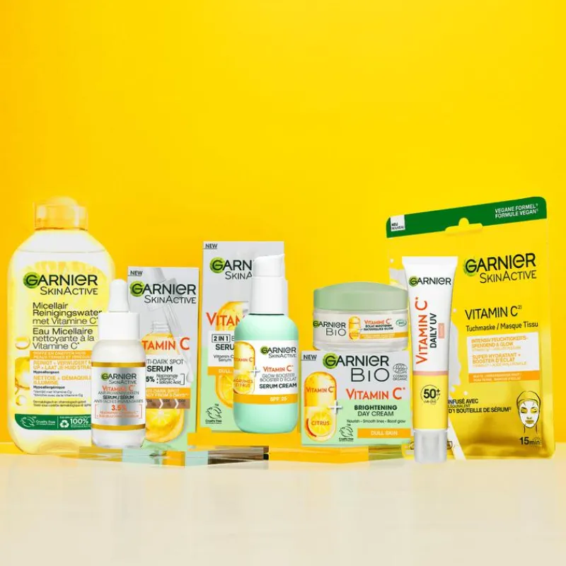 Ontdek onze Garnier SkinActive Vitamin C Daily UV Brightening Fluid, een revolutionaire dagelijkse gezichtsverzorging die niet alleen je huid stralender maakt, maar ook de zichtbaarheid van pigmentvlekken vermindert. Deze unieke formule met een lichte tint zorgt voor een direct stralend effect en laat geen witte waas achter na het uitsmeren.