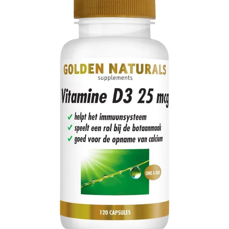 Golden Naturals Vitamine D3 25 mcg ondersteunt het immuunsysteem, helpt het behoud van sterke botten en is goed voor de spieren. Deze formule bevat goed opneembare D3-vorm.
