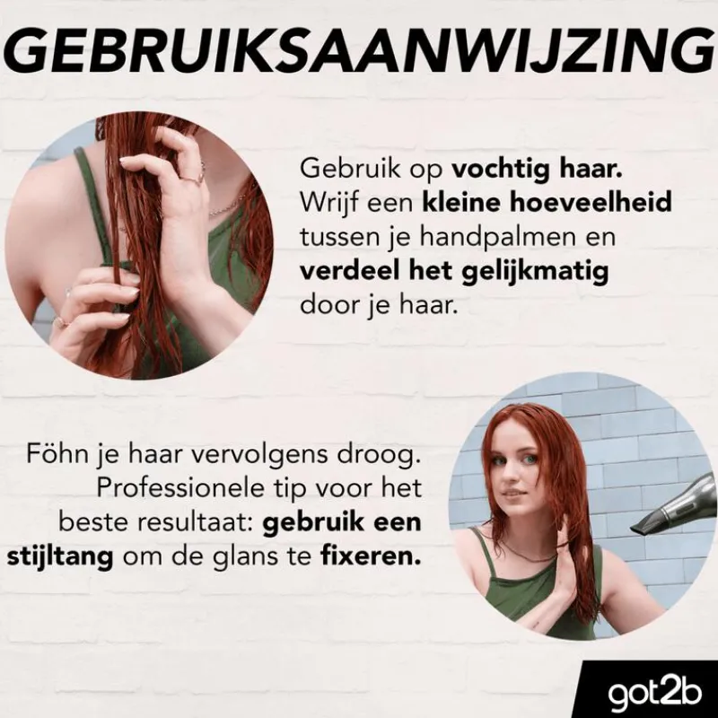Wrijf een kleine hoeveelheid tussen de handpalmen en verdeel gelijkmatig over vochtig haar. Het haar droogföhnen en stijlen voor een glanzende look. Voor nog meer glans, combineer met got2b gotGLOSS Shine Finish Hairspray.