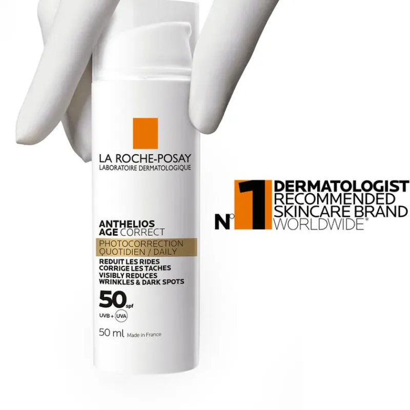 Anthelios Age Correct SPF50 zonbescherming is een zonnecrème tegen rimpels en donkere vlekjes voor het gezicht met een zeer hoge SPF 50 UVA/UVB-bescherming. De crème helpt de tekenen van huidveroudering in 4 weken verkomen en verminderen door fijne lijntjes en rimpels op te vullen en de fysiologische mechanismen van huidvernieuwing te stimuleren. De zonnecrème biedt ook bescherming tegen vervuiling (door de aanhechting van vervuilende deeltjes op de huid te beperken) en bescherming tegen oxidatie (door oxidatieve stress veroorzaakt door vervuiling en infrarood te voorkomen).