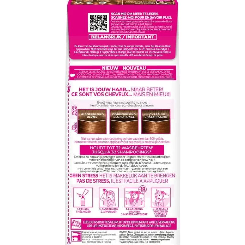 Voorzorgsmaatregelen: Doe een allergie waarschuwingstest 48 uur vóór iedere haarkleurbehandeling ook indien je al eerder een kleurproduct hebt gebruikt. In de gebruiksaanwijzing in de verpakking staat beschreven hoe je dit doet. Volg tijdens het kleuren de gebruiksaanwijzing nauwkeurig op. Hoeveel verpakkingen heb ik nodig? Heb je kort haar of haar tot op je schouders? Dan is één verpakking voldoende. Bij halflang tot lang haar heb je twee verpakkingen nodig.Stap 1: Voorbereiden Voordat je begint: kam je haar en bedek je schouders met een oude handdoek. Verwijder de dop van de tube kleurcrème. Verwijder de grijze ring. Schroef de dop terug op de tube om te openen. Verwijder de dop van de flacon ontwikkelcrème. De dop van de kleurcrème tube is al geopend bij het doen van de allergie waarschuwingstest. Voeg vervolgens de gehele inhoud van de tube kleurcrème toe aan de aanbrengflacon met de ontwikkelcrème. Sluit zorgvuldig de aanbrengflacon gevuld met ontwikkelcrème. Schud krachtig om een perfect egaal kleurmengsel te krijgen. Draai na het mengen onmiddellijk het uiterste topje van de aanbrengflacon af om ongewenst spatten te vermijden, omdat er druk op staat. Stap 2: Aanbrengen Optie 1: Op natuurlijk haar Voor natuurlijk haar of haar dat meer dan 3 maanden geleden gekleurd is. Breng het kleurmengsel lok voor lok op het haar aan op het gehele haar. Maak scheidingen met de punt van de aanbrengflacon. Verdeel de rest van het kleurmengsel over de lengtes en de punten van het haar. Zorg ervoor al het kleurmengsel te gebruiken. Masseer om ervoor te zorgen dat het product grondig inwerkt op het haar en goed verdeeld is. Laat 20 minuten inwerken. Optie 2: Op gekleurd haar Voor haar dat minder dan 3 maanden gekleurd is. Breng het kleurmengsel lok voor lok op de haaraanzet aan. Maak scheidingen met de punt van de aanbrengflacon. Masseer de haaraanzet goed zodat het kleurmengsel goed wordt verdeeld. Laat 15 minuten inwerken op de haaraanzet. Verdeel vervolgens de rest van het kleurmengsel over de lengtes en de punten van het haar. Zorg ervoor al het kleurmengsel te gebruiken. Masseer om ervoor te zorgen dat het product grondig inwerkt op het haar en goed verdeeld is. Laat het product nog 5 minuten inwerken. Stap 3: Spoelen Breng een beetje lauw water aan op het haar en masseer in. Spoel het haar overvloedig met lauw water totdat het spoelwater helder is. Stap 4: Verzorging Breng een royale hoeveelheid van de conditioner aan op het haar. Laat het 2 minuten inwerken. Spoel grondig uit met lauw water. Bewaar de restanten van de conditioner. Dit kan hergebruikt worden om na het wassen van het haar de glans te versterken.