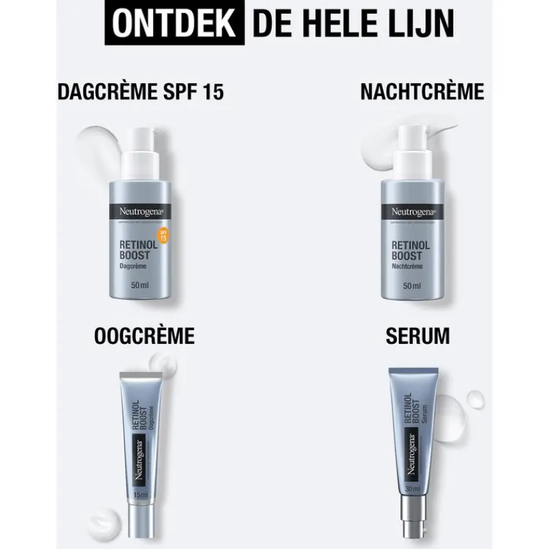 De Neutrogena Retinol Boost Dagcrème met SPF 15 is een beschermende anti-aging dagcrème met pure Retinol, mirtebladextract en hyaluronzuur en zorgt voor een jongere en gezond uitziende huid. De dagcrème bestrijdt zichtbare tekenen van huidveroudering: rimpels, afgenomen strakheid, vermoeide huid, droogheid en pigmentvlekken. De verzorgingscrème met SPF 15 biedt een eerste bescherming tegen de dagelijkse invloeden van de zon.