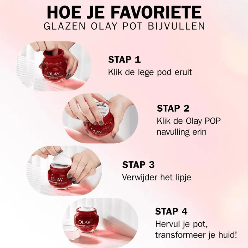 - Olay POP-navulling, het eerste moeiteloze navulsysteem van Olay: bewaar je lege pot en klik er een Olay POP-navulling in
