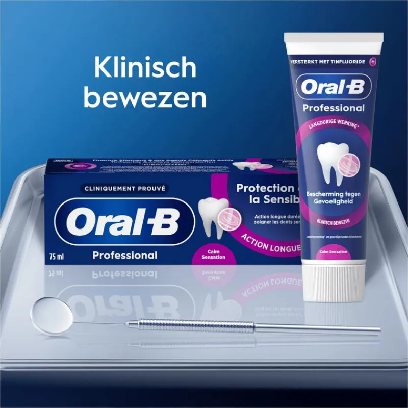 Oral-B Professional Bescherming Gevoelige Tanden Kalmerende Sensatie is klinisch bewezen: het biedt langdurige bescherming voor gevoelige tanden, bij voortdurend gebruik. De unieke antibacteriële technologie van Oral-B met tinfluoride-complex en actieve kalmerende bestanddelen creëert een beschermend schild om gevoelige tanden effectief te beschermen, zelfs tussen de poetsbeurten door, terwijl het een verkoelend gevoel geeft tijdens en na het poetsen. Geschikt voor gevoelige tanden. Dagelijkse tandpasta.