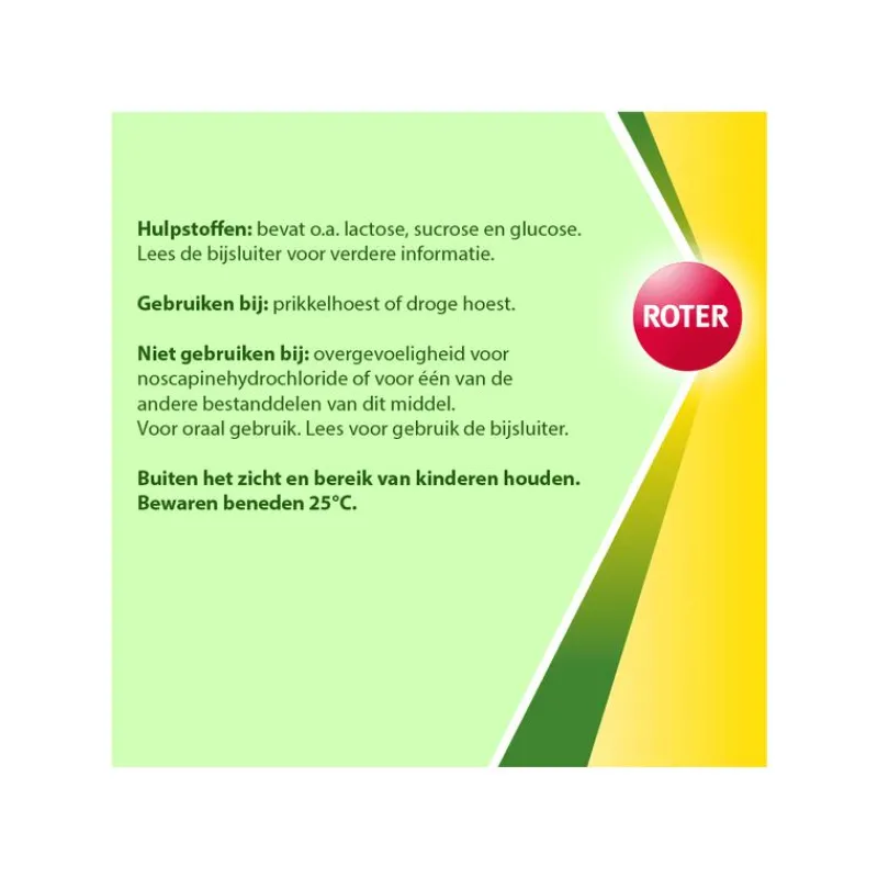 Roter Noscapect Tabletten is een geneesmiddel ter verlichting van droge hoest (). Heeft u al een tijdje last van een vervelende hoest? Komt er bij het hoesten weinig slijm vrij en voelt de hoest droog of prikkelbaar aan? Het is niet ongewoon dat droge hoest niet vanzelf verdwijnt. In dergelijke gevallen is het aan te raden om Roter Noscapect te gebruiken, met de werkzame stof noscapinehydrochloride. Dit middel helpt de hoestprikkel te verlichten, voorkomt dat uw droge hoest verergert door overmatig hoesten, en bevordert een betere nachtrust. Hoesten is een natuurlijke reactie van het lichaam wanneer de luchtwegen geïrriteerd zijn. Een ‘gewone’ hoest zorgt ervoor dat u schadelijke stoffen kwijtraakt door het ophoesten van slijm, wat de hoest kalmeert. Bij een droge hoest heeft u echter geïrriteerde luchtwegen en wordt er geen slijm opgehoest. Het overmatige hoesten kan de hoestklachten verergeren, en Roter Noscapect kan helpen door de hoestprikkel te verminderen.