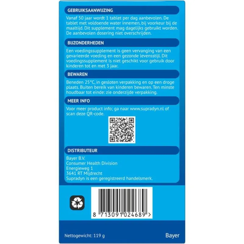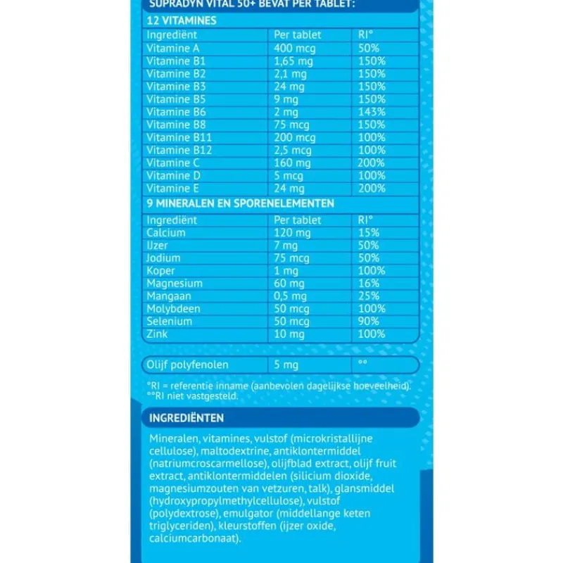 Supradyn Vital 50+ bevat een combinatie van vitamines die voorzien in de veranderende behoefte van je lichaam vanaf 50 jaar. De vitamines B1, B2, B3, B5, B6, B8, B12, C, het mineraal magnesium en het sporenelement ijzer ondersteunen je energieniveau en houden je vitaal. De mineralen ijzer, jodium en zink zijn goed voor het geheugen en behoud van een heldere geest. ; Essentiële vitamines en mineralen spelen een belangrijke rol bij de energiestofwisseling. Supradyn Vital 50+ ondersteunt je energieniveau* en helpt je om geestelijk** en lichamelijk* vitaal te blijven. *De vitamines B1, B2, B3, B5, B6, B8, B12, C, het mineraal magnesium en het sporenelement ijzer ondersteunen je energieniveau en houden je vitaal zodat je de dingen kunt blijven doen die je graag doet. ; **De mineralen ijzer, jodium en zink zijn goed voor het geheugen en behoud van een heldere geest.