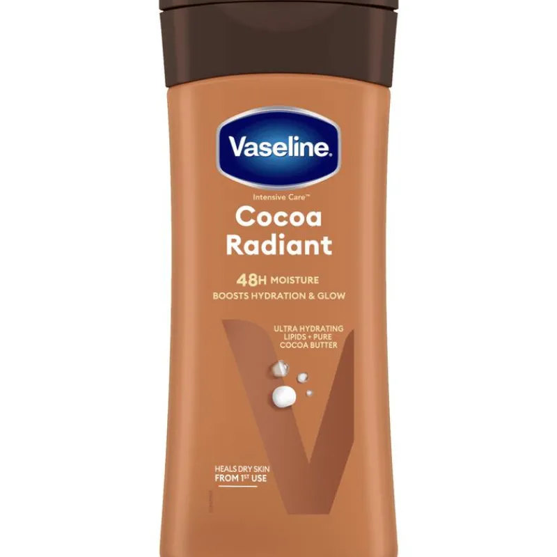 Vaseline Intensive Care Cocoa Radiant Bodylotion hydrateert en verzacht de droge huid tot 48 uur op intensieve wijze, om de natuurlijke glans te onthullen.