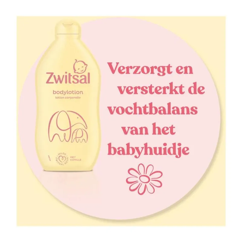 Zwitsal Baby Bodylotion biedt de meest pure verzorging voor het zachte en soepele babyhuidje. Deze verzorgende bodylotion heeft een vernieuwde formule met de milde Zwitsal-geur en kamille. De bodylotion hydrateert en beschermt het huidje met huideigen ingrediënten. Dit zijn bestanddelen die ook van nature voorkomen in de huid en daar belangrijk zijn voor het ondersteunen van de beschermende werking van de huid. Ze zijn belangrijk voor een goede barrièrewerking van de huid. Een gezonde huidbarrière zorgt dat vocht behouden wordt en beschermt tegen invloeden van buitenaf. Zo blijft het huidje knuffelzacht en weerbaar. Zwitsal Bodylotion is dermatologisch getest, bevat ingrediënten van natuurlijke oorsprong en bevat geen kleurstof.